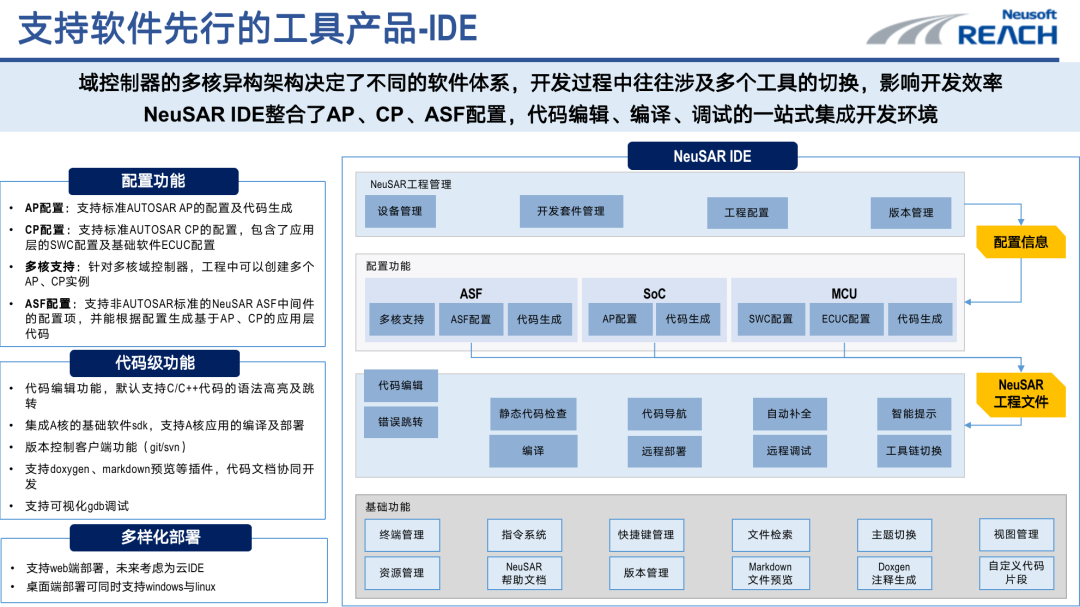 支持軟件先行的工具產(chǎn)品—IDE,為域控制器開發(fā)提供一站式集成開發(fā)環(huán)境。域控制器的多核異構(gòu)架構(gòu)決定需要使用不同的軟件架構(gòu)體系,但每種體系各有不同的開發(fā)工具及流程,導(dǎo)致開發(fā)效率低、難以高效協(xié)作等問題。NeuSAR IDE讓開發(fā)者在一套工具鏈中可以完成整個(gè)開發(fā)過程,使上下游的開發(fā)過程配合更緊密,實(shí)現(xiàn)無縫協(xié)同,從而加快開發(fā)效率。