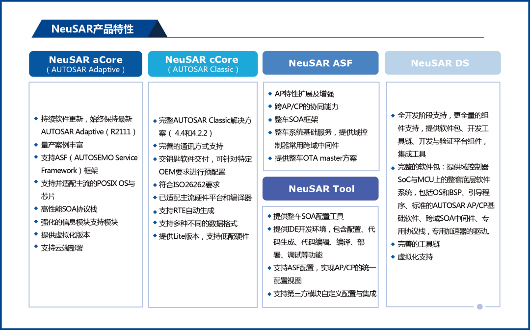 東軟睿馳也在實(shí)踐中不斷探索,把一部分通用化的部分固化下來(lái),整合成針對(duì)域控制器的軟件開(kāi)發(fā)平臺(tái)——NeuSAR DS(Domain System),它包含了OS,AUTOSAR AP、CP,ASF中間件以及大量的系統(tǒng)級(jí)軟件包和工具鏈。