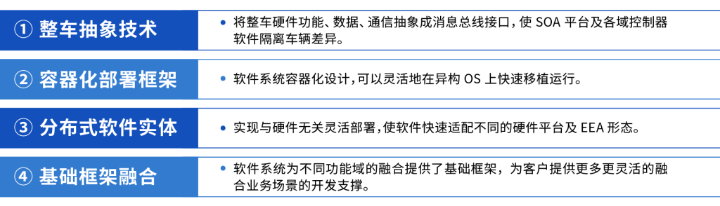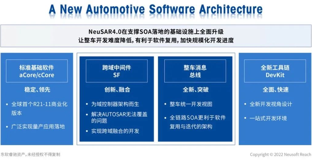 面對(duì)多域融合的產(chǎn)業(yè)變革趨勢(shì),結(jié)合“集中式”SOA軟件架構(gòu)設(shè)計(jì)的布局,東軟睿馳在2022年12月發(fā)布了基礎(chǔ)軟件新版本——NeuSAR 4.0,引入關(guān)鍵SOA跨域融合的基礎(chǔ)設(shè)施,將開發(fā)視圖從域控制器層面向整車層面遷移,解決多核異構(gòu)域控制器的軟件部署難題,降低軟件開發(fā)難度、提高軟件復(fù)用度、提升開發(fā)效率。