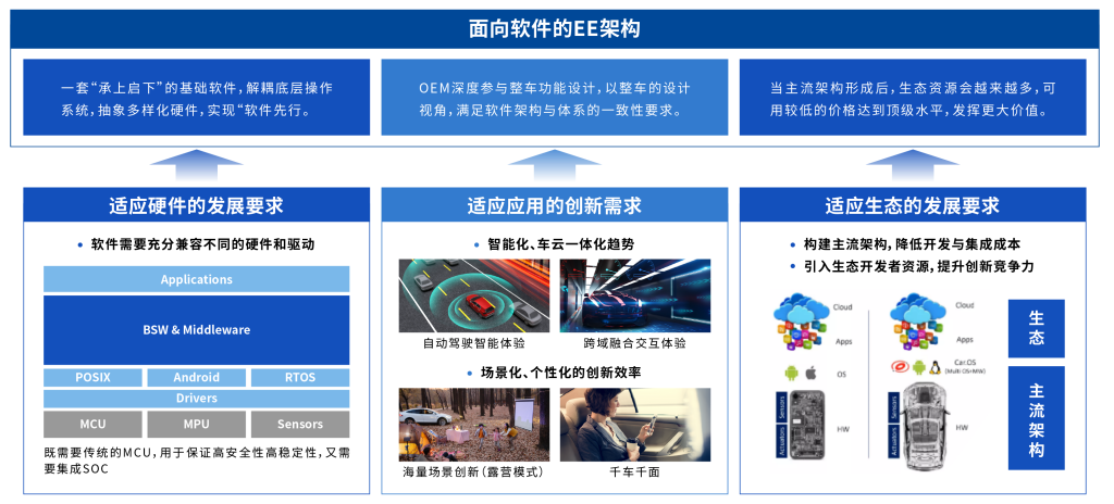 “創(chuàng)新速度”與“成本”的催化下,實(shí)現(xiàn)多域融合、自動(dòng)駕駛、整車控制到人車交互等綜合的場景化、智能化服務(wù),需要“集中式”SOA軟件架構(gòu)設(shè)計(jì)方法?!凹惺健遍_發(fā)是指多控制器使用統(tǒng)一的開發(fā)視圖與開發(fā)方法,對(duì)比傳統(tǒng)的多控制器同時(shí)開發(fā),“集中式”開發(fā)的速度更快,更容易實(shí)現(xiàn)一次開發(fā)多車型通用,在OTA升級(jí)頻率、代碼量、開發(fā)方式、開發(fā)效率等外在表現(xiàn)價(jià)值方面來看尤為明顯。