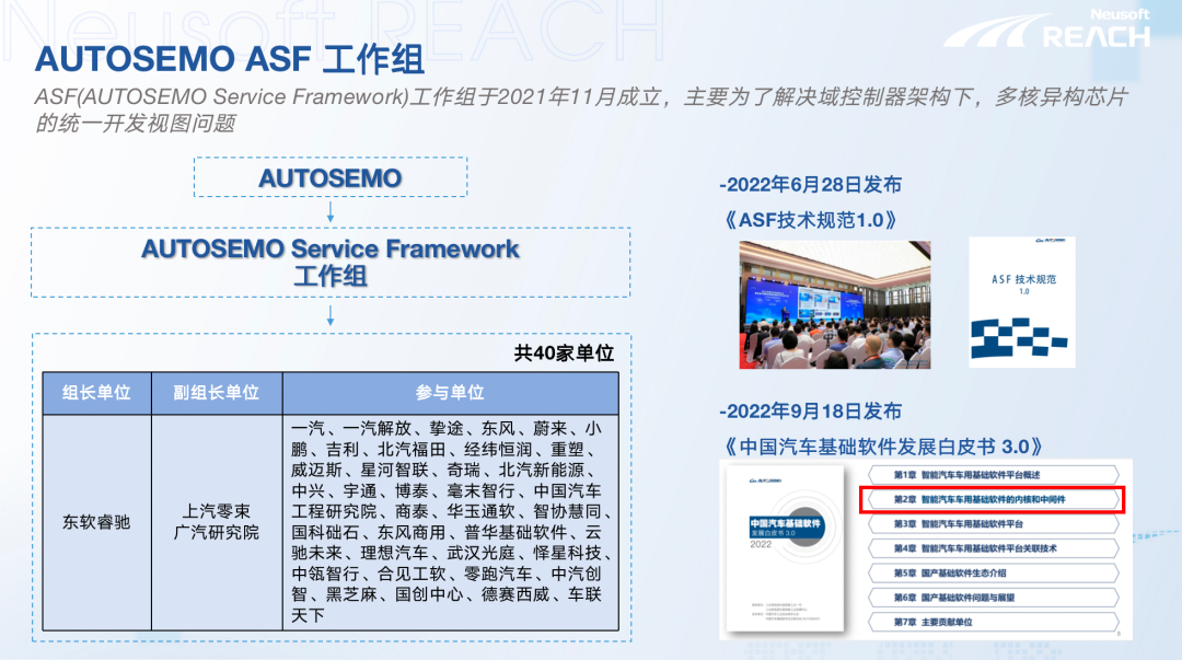 東軟睿馳作為中國汽車工業(yè)協(xié)會軟件分會汽車基礎(chǔ)軟件生態(tài)標(biāo)委會(AUTOSEMO)創(chuàng)始會員單位,聯(lián)合廣汽研究院及國內(nèi)主流車企、零部件供應(yīng)商單位進(jìn)行ASF技術(shù)規(guī)范的立項(xiàng)、調(diào)研、組織修訂和編制等工作。ASF面向SOA服務(wù)開發(fā)視角,構(gòu)建了進(jìn)一步向應(yīng)用層、SOA體系架構(gòu)拓展的中間框架,通過提供系統(tǒng)級服務(wù)、SOA+、原子服務(wù)、整車級系統(tǒng)服務(wù)、動(dòng)態(tài)服務(wù)等,助力整車在軟件架構(gòu)層面上實(shí)現(xiàn)相對標(biāo)準(zhǔn)化、穩(wěn)定并且有生態(tài)支撐的應(yīng)用運(yùn)行體系框架。