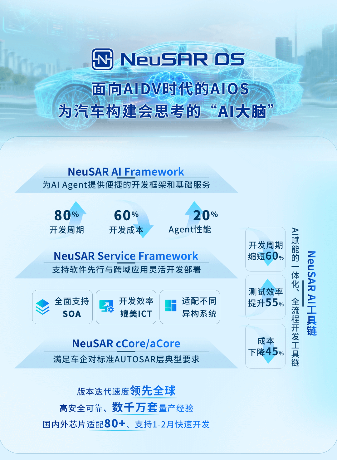 在AIDV趨勢(shì)加速落地的關(guān)鍵時(shí)期,東軟睿馳率先推出了面向AIDV時(shí)代的AIOS——NeuSAR OS,通過(guò)開(kāi)放、可擴(kuò)展的架構(gòu)設(shè)計(jì),在系統(tǒng)層面提供專門(mén)針對(duì)車(chē)內(nèi)AI應(yīng)用開(kāi)發(fā)、部署及迭代的平臺(tái)能力支撐,助力車(chē)企高效構(gòu)建具備持續(xù)進(jìn)化能力的智能汽車(chē)軟件平臺(tái)化底座,同時(shí)提供AI賦能的工具鏈,從智能編碼到自動(dòng)測(cè)試,讓汽車(chē)軟件研發(fā)效能與智能汽車(chē)的進(jìn)化速度同頻,質(zhì)量效率雙升,成本風(fēng)險(xiǎn)雙降。