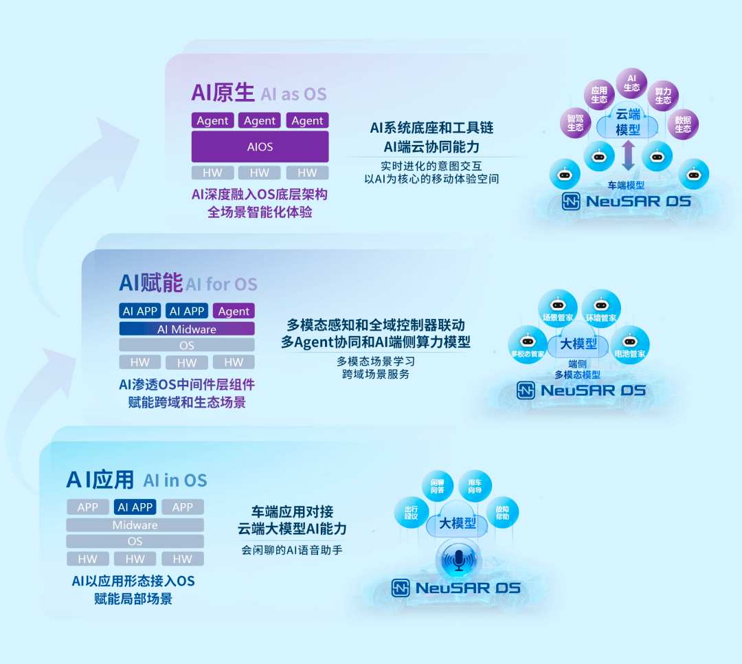 在此背景下,AI 能力需要由外而內(nèi)地融入汽車(chē)操作系統(tǒng)架構(gòu)中,從“AI in OS——AI以應(yīng)用形態(tài)接入OS,賦能局部場(chǎng)景”到“AI for OS——AI滲透OS中間件層組件,賦能跨域和生態(tài)場(chǎng)景”,最終邁向“AI as OS——AI深度融入OS底層架構(gòu),支撐全場(chǎng)景智能化體驗(yàn)”的原生形態(tài),真正實(shí)現(xiàn)汽車(chē)智能化場(chǎng)景體驗(yàn)的全面升級(jí)。