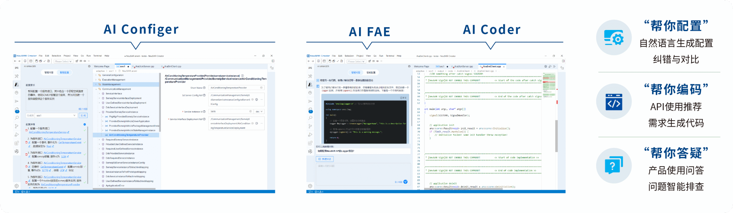 NeuSAR AI工具鏈,提供針對域控制器級&整車級設計、開發(fā)、調試、仿真于一體的全流程生態(tài)工具鏈,并通過AI技術提供一系列智能化輔助功能,大幅降低開發(fā)復雜度,實現(xiàn)降本增效。